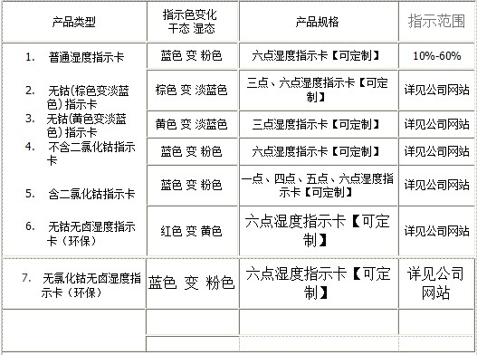 货物在贮存和运输过程中不发生霉变的决定因素是相对湿度RH<50%,相对湿度RH(Relative Humidity)可用干燥剂控制,而当干燥剂吸水达到一定程度后就会失去作用。用湿度指示卡则可以清楚地指示容积内的相对湿度RH值,以确定干燥剂是否失效或是否需要更换。 湿度指示卡(Humidity Indicator Cards) 应用于对湿度较敏感的高档电子元器件和仪器仪表的密封包装中(如集成电路、IC、芯片等),随着该行业环保要求的提升,本公司开发了系列无钴和无卤的环保型湿度指示卡。 湿度指示卡用来显示封闭空间的相对湿度,不可以接近液态水。指示圆点内的颜色随湿度不同而变化,不同产品的干态和湿态的颜色变化都易于识别,指示值稳定且可重复使用。